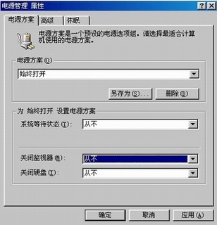 這種情況是因?yàn)闆](méi)有取消屏幕保護(hù)或電源管理設(shè)置不當(dāng)所引起。解決辦法是從監(jiān)控系統(tǒng)退出到WINDOWS操作系統(tǒng)界面后,在界面上點(diǎn)擊鼠標(biāo)右鍵,選擇“屬性”后,在出現(xiàn)的標(biāo)簽里選擇屏幕保護(hù),選擇(無(wú))一項(xiàng)解除屏保。然后點(diǎn)擊右下角的設(shè)置按鈕,在電源使用方案里選擇"始終打開(kāi)",系統(tǒng)等待選擇"從不",關(guān)閉監(jiān)視器出選擇"從不",“關(guān)閉硬盤(pán)”處選擇"從不",最后點(diǎn)擊“確定”即可。