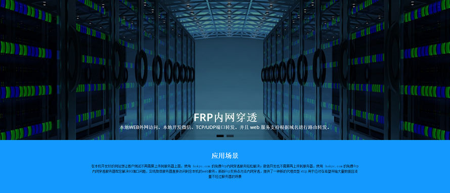 在本機開發(fā)好的網(wǎng)站想讓客戶測試不再需要上傳到服務器上面,使用hskyc.com的免費Frp內網(wǎng)穿透服務輕松解決;微信開發(fā)也不需要再上傳到服務器,使用hskyc.com的免費Frp內網(wǎng)穿透服務器幫您解決80端口問題,實現(xiàn)微信服務器直接訪問到您本機的web服務。新版Frp支持點對點內網(wǎng)穿透,提供了一種新的代理類型 xtcp 用于應對在希望傳輸大量數(shù)據(jù)且流量不經(jīng)過服務器的場景。